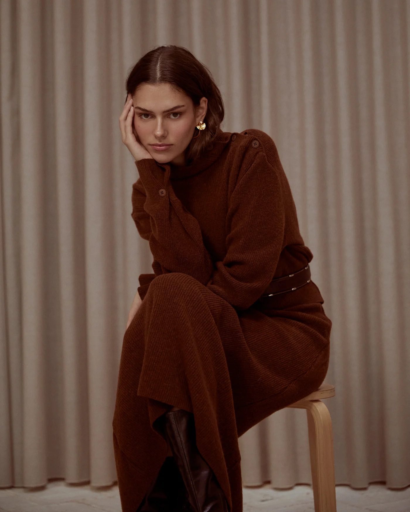 Las trayectorias de Enrica Blanc y Luciana Paluzzi están conectadas por su contribución al cine de género italiano, donde ambas representaron personajes femeninos fuertes y dejaron una marca en los géneros de terror y espionaje. Son reconocidas como iconos de belleza y como actrices de culto dentro de este ámbito cinematográfico. Jersey de cuello alto con botonadura lateral hasta el hombro. Los puños se ciñen con botón creando un pliegue sofisticado. Está confeccionado en una hilatura 100% de lana merino. Llévalo a conjunto con la falda Luciana y te harás notar allá donde vayas sin perder el confort. Hecho a mano en España.