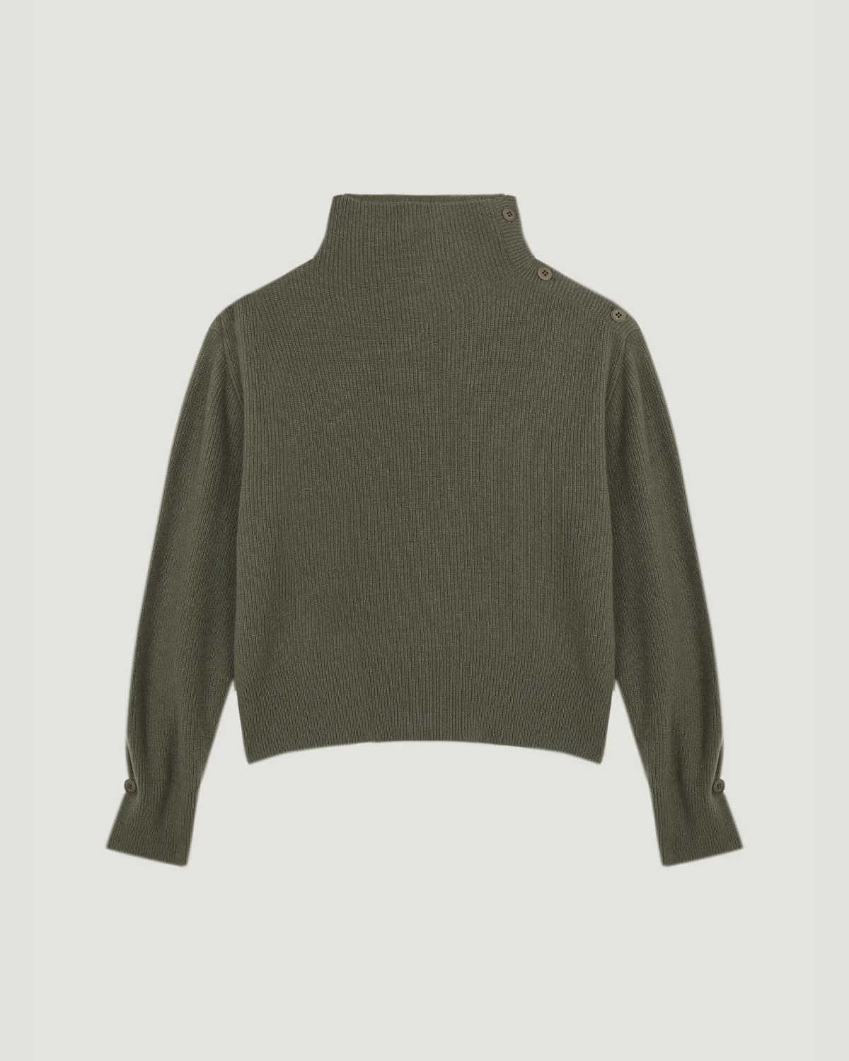 Las trayectorias de Enrica Blanc y Luciana Paluzzi están conectadas por su contribución al cine de género italiano, donde ambas representaron personajes femeninos fuertes y dejaron una marca en los géneros de terror y espionaje. Son reconocidas como iconos de belleza y como actrices de culto dentro de este ámbito cinematográfico. Jersey de cuello alto con botonadura lateral hasta el hombro. Los puños se ciñen con botón creando un pliegue sofisticado. Está confeccionado en una hilatura 100% de lana merino. Llévalo a conjunto con la falda Luciana y te harás notar allá donde vayas sin perder el confort. Hecho a mano en España.