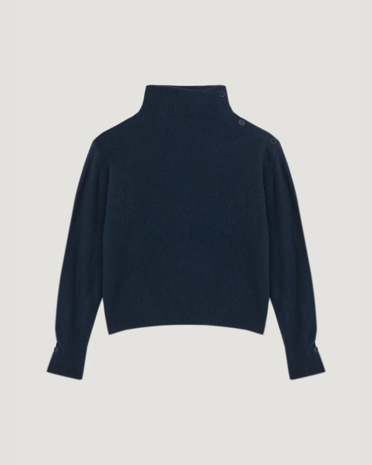 Las trayectorias de Enrica Blanc y Luciana Paluzzi están conectadas por su contribución al cine de género italiano, donde ambas representaron personajes femeninos fuertes y dejaron una marca en los géneros de terror y espionaje. Son reconocidas como iconos de belleza y como actrices de culto dentro de este ámbito cinematográfico. Jersey de cuello alto con botonadura lateral hasta el hombro. Los puños se ciñen con botón creando un pliegue sofisticado. Está confeccionado en una hilatura 100% de lana merino. Llévalo a conjunto con la falda Luciana y te harás notar allá donde vayas sin perder el confort. Hecho a mano en España.
