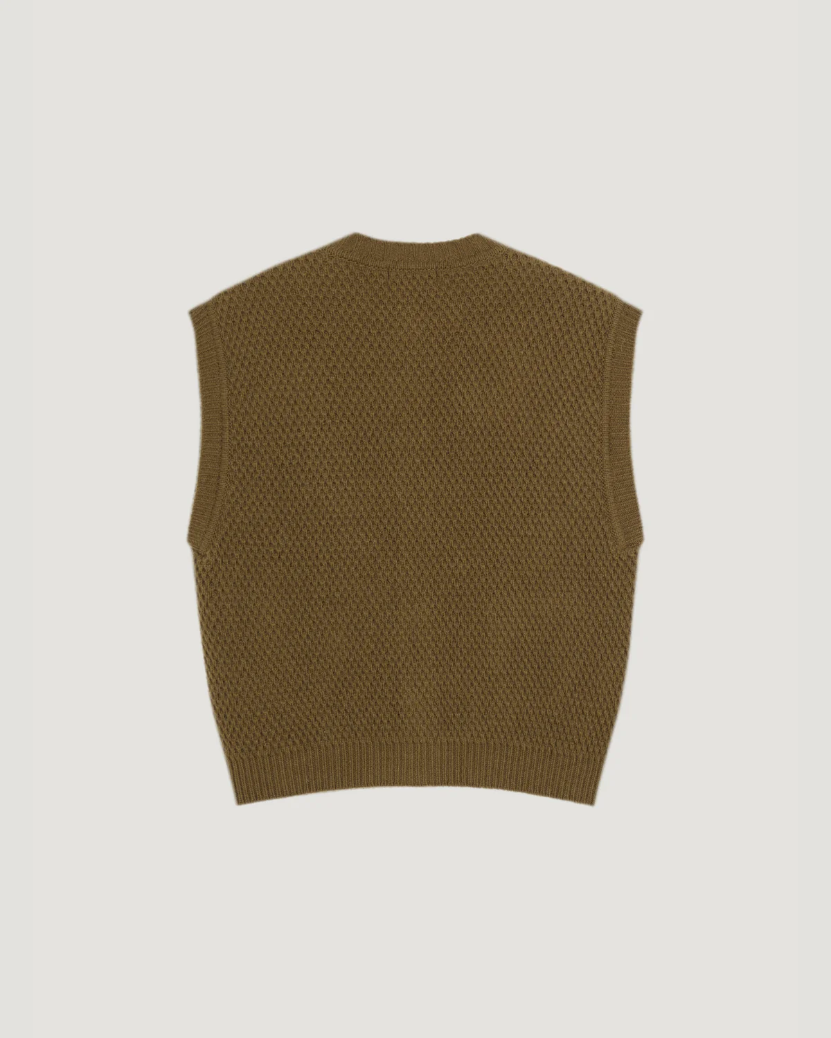 Monica Vitti, referente del cine de autor italiano, fue pionera en su representación de personajes femeninos complejos y psicológicos. Era un icono de belleza más intelectual y melancólico. Su imagen proyectaba una belleza introspectiva que la hacía única en comparación con las otras. Chaleco con botonadura delantera y bolsillos vistos con detalle de contraste en dibujo estilo gofrado a juego con la espalda. Está confeccionado en una hilatura 100% de lana merino. Una pieza básica que destaca por su versatilidad, puedes combinarlo con el jersey Sofia o con cualquier camisa que tengas en el armario. Hecho a mano en España.