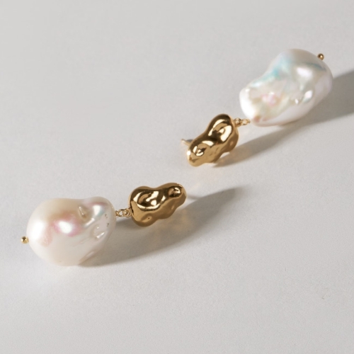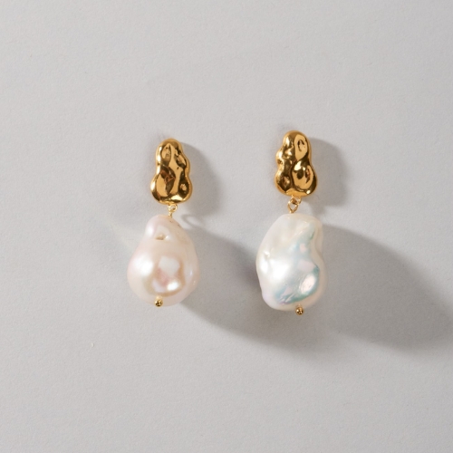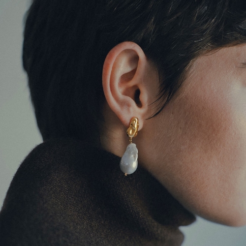 Pendientes con cierre de plata chapada en oro de 24kt y con dos perlas barrocas naturales grandes colgantes. El diseño del cierre está creado por el equipo de Malababa, imitando la textura irregular de las perlas. El concepto de esta línea de joyería tiene como inspiración los paisajes paradisíacos de Tahití, una de las perlas del pacífico.